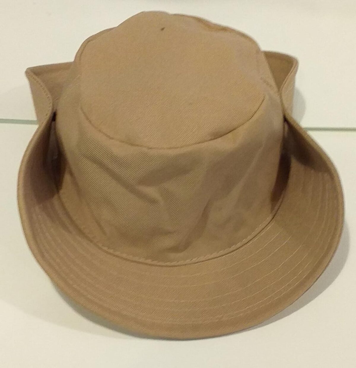 Lindo chapéu pescador infantil caqui, liso. Possui aba reforçada e cordão preto, para ser pendurado. Protege bem o rosto e pescoço do sol.