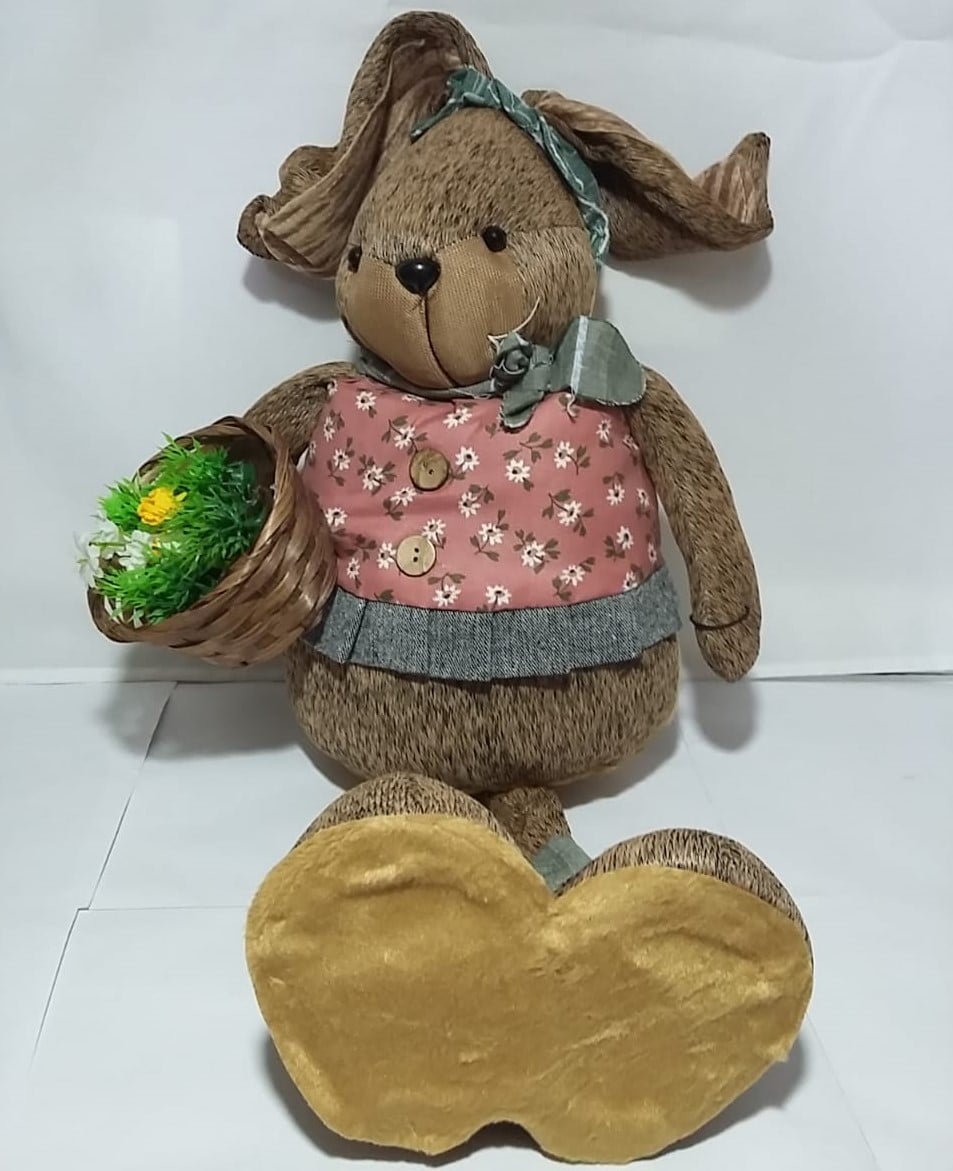linda coelha de pelúcia com delicado vestido e fita na cabeça.