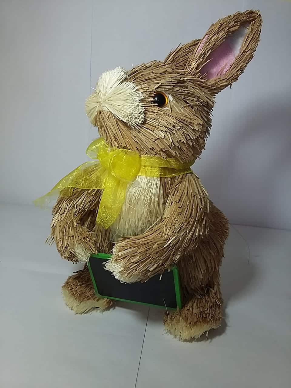 Lindo coelho de material natural tipo palha com uma delicada gravata amarela segurando uma mini lousa na pata.