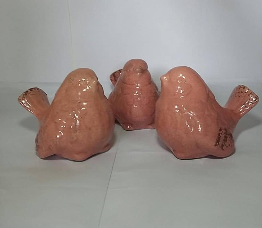 Lindos passarinhos de cerâmica na cor rosé com traços bem sutis de marrom.
