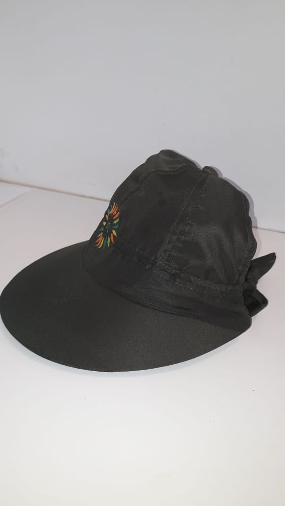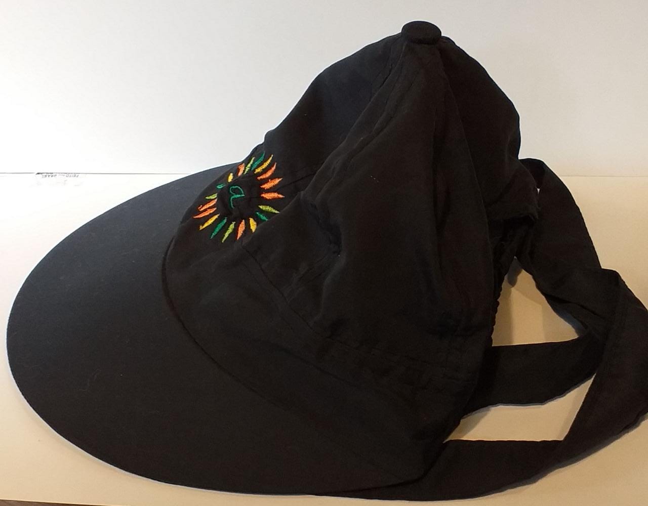 Viseira feminina em tecido tactel preta, com aba maior na frente, reduzindo nas laterais. Atrás possui elástico que faz com que vista bem e possui fita larga de tecido tactel. O tecido tactel é fresco e também seca facilmente. Boa para carregar para viagens, pois seu tecido de tactel não amassa, fica bem fininnha na mala (não ocupa volume) e pesa 79grs. Perfeita para suas viagens. Possui logo amantikir bordado (flor de folhas nos tons verde, amarelo, laranja e cru com a verde no centro) na região frontal da viseira.